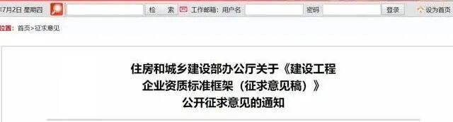 2020年7月2號(hào),住房和城鄉(xiāng)建設(shè)部辦公廳發(fā)布了關(guān)于《建設(shè)工程企業(yè)資質(zhì)標(biāo)準(zhǔn)框架(征求意見(jiàn)稿)》公開(kāi)征求意見(jiàn)的通知。