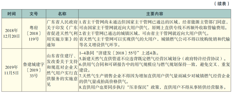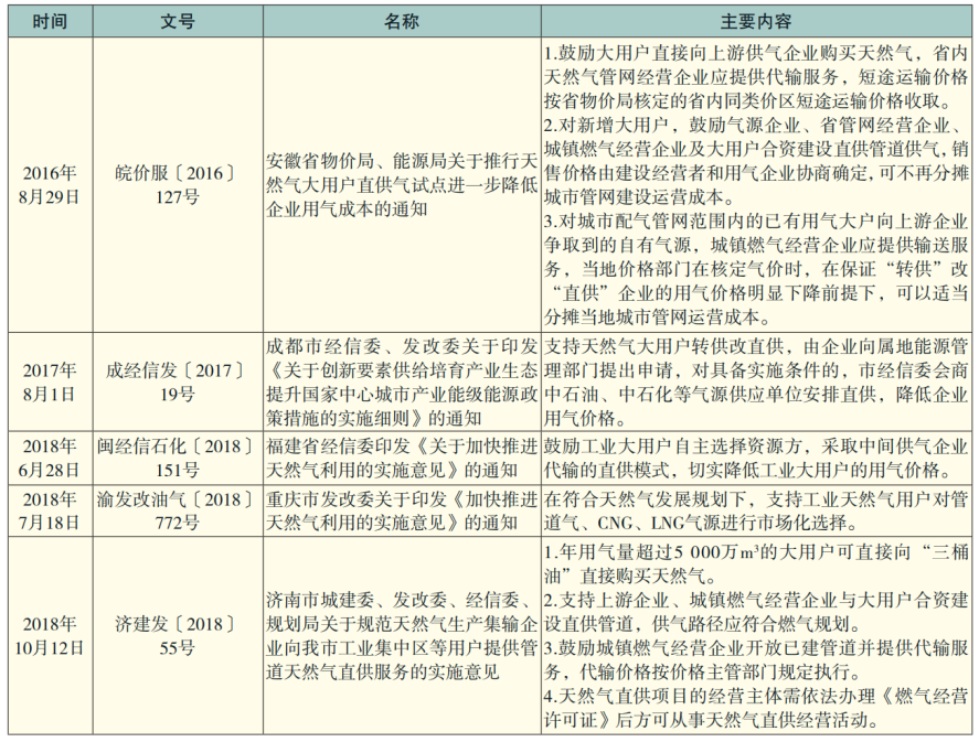 目前,業(yè)內(nèi)普遍談到的大用戶直供,是源自2017 年6月國家發(fā)改委《加快推進(jìn)天然氣利用的意見》 (以下簡稱《意見》)?!兑庖姟诽岢觥敖∪烊粴馐?場,建立用戶自主選擇資源和供氣路徑的機(jī)制。用戶 自主選擇資源方和供氣路徑的,應(yīng)當(dāng)符合當(dāng)?shù)爻青l(xiāng)發(fā) 展規(guī)劃、天然氣和燃?xì)獍l(fā)展等專項規(guī)劃,地方人民政 府應(yīng)加強(qiáng)統(tǒng)籌協(xié)調(diào)給予支持?!?nbsp; 大用戶直供推行的方式,必須與用戶用氣是否可 中斷、地方燃?xì)鈱m椧?guī)劃、城鎮(zhèn)燃?xì)饨?jīng)營企業(yè)的經(jīng)營 情況和用戶結(jié)構(gòu)相關(guān)聯(lián)。分為2種模式: (1)“直購+代輸”模式:大用戶與上游單位 簽訂天然氣購銷協(xié)議,采購氣量通過地方城鎮(zhèn)燃?xì)饨?jīng) 營企業(yè)已建設(shè)的“一張網(wǎng)”代輸。以重慶、廣東、福建部分地區(qū)為代表。 (2)“直購+新建”模式:大用戶與上游單位 單獨簽訂天然氣購銷協(xié)議,并通過與多個投資主體合資合作形式建設(shè)輸氣管道設(shè)施,從輸氣管網(wǎng)單獨開口接氣使用。以江蘇部分地區(qū)為代表。 筆者認(rèn)為,第一種模式與燃?xì)馓卦S經(jīng)營制度尚可協(xié)調(diào),符合國家“X+1+X”改革方向,是未來行業(yè)市場化改革發(fā)展的趨勢;但是第二種模式與國家改革思路、管網(wǎng)設(shè)施“一張網(wǎng)”規(guī)劃和《城鎮(zhèn)燃?xì)夤芾項l 例》相矛盾,必須妥善處理政府、大用戶、上游單位 與地方城鎮(zhèn)燃?xì)饨?jīng)營企業(yè)四者的關(guān)系,應(yīng)運用法治思維法治方式推進(jìn)大用戶直供,釋放改革紅利。 自2013年開始,國家發(fā)改委在推進(jìn)天然氣價格市 場化改革中,出臺了一些鼓勵大用戶直供的政策,詳 見表1。表1 國家層面大用戶直供有關(guān)政策梳理情況3.1 業(yè)主自建“直供管道”與“燃?xì)馓卦S經(jīng)營制度” 的沖突分析 燃?xì)馓卦S經(jīng)營制度實施以來,在規(guī)范城市燃?xì)?基礎(chǔ)設(shè)施投資建設(shè)與運營管理方面發(fā)揮了積極的作 用,一定程度上促進(jìn)了城市燃?xì)馐袌龅陌l(fā)展,可謂立 下“汗馬功勞”[2]。業(yè)主在管道已覆蓋且特許經(jīng)營權(quán) 已授予的地區(qū)自建“直供管道”與國家現(xiàn)行法規(guī)有沖 突,并非國家政策所鼓勵,違反了城市管道燃?xì)馓卦S 經(jīng)營制度,分析如下。 一是國家只是鼓勵上下游之間直接購銷天然氣而不是指重復(fù)規(guī)劃建設(shè)燃?xì)廨敋夤艿馈!?/strong>加快推進(jìn)天然 氣利用的意見(征求意見稿)》指出:“完善城鎮(zhèn)燃?xì)馓?許經(jīng)營權(quán)政策,放開大用戶直供直銷”。當(dāng)初在討論時,因該表述含有允許天然氣供應(yīng)商單獨為城市的工 業(yè)大用戶修管道并專供天然氣之意[3],違反了城市統(tǒng) 一規(guī)劃布局的“一張網(wǎng)”燃?xì)鈱m椧?guī)劃,也損害了城鎮(zhèn)燃?xì)饨?jīng)營企業(yè)的利益,遭到了明確反對。因此,最 終發(fā)布的正式《意見》中找不到“直供”的表述。按 照規(guī)劃法律法規(guī)要求,燃?xì)庠O(shè)施的建設(shè)應(yīng)符合城鄉(xiāng)規(guī) 劃和城市燃?xì)鈱m椧?guī)劃,避免重復(fù)規(guī)劃和投資浪費。 二是燃?xì)馓卦S經(jīng)營協(xié)議約定了城鎮(zhèn)燃?xì)饨?jīng)營企業(yè)對業(yè)主專有產(chǎn)權(quán)以外燃?xì)庠O(shè)施的投資建設(shè)權(quán)利。原建設(shè)部公布的《管道燃?xì)馓卦S經(jīng)營協(xié)議示范文本》 (GF-2004-2502)中明確,經(jīng)政府依法授予的城鎮(zhèn) 燃?xì)饨?jīng)營企業(yè),享有特許經(jīng)營權(quán)范圍內(nèi)的管道燃?xì)鈽I(yè)務(wù)獨家經(jīng)營的權(quán)利,擁有特許經(jīng)營權(quán)范圍內(nèi)的管道燃?xì)獾耐顿Y、建設(shè)、經(jīng)營權(quán)利,該權(quán)利具有排他性、唯一性。 三是城鎮(zhèn)燃?xì)饨?jīng)營者負(fù)責(zé)按燃?xì)庖?guī)劃投資、建設(shè)、運行、維護(hù)管理燃?xì)庠O(shè)施,是國家賦予的法定職責(zé)。《城鎮(zhèn)燃?xì)夤芾項l例》規(guī)定,城鎮(zhèn)燃?xì)饨?jīng)營者對 用戶建筑區(qū)劃內(nèi)業(yè)主專有部分以外的燃?xì)庠O(shè)施,承擔(dān) 運行、維護(hù)、搶修和更新改造的責(zé)任。2020年新修訂 的《江蘇省燃?xì)夤芾項l例》規(guī)定,管道燃?xì)饨?jīng)營者應(yīng) 當(dāng)按照城鎮(zhèn)燃?xì)獍l(fā)展規(guī)劃投資、建設(shè)燃?xì)庠O(shè)施。2019年新修訂的《河北省燃?xì)夤芾項l例》規(guī)定,在城鎮(zhèn)燃 氣經(jīng)營企業(yè)建設(shè)的符合燃?xì)鈱m椧?guī)劃的管網(wǎng)覆蓋范圍內(nèi),用氣企業(yè)擅自建設(shè)的獨立供氣設(shè)施包括點供站、直供管道都是不合法的。 四是政府支持城鎮(zhèn)燃?xì)饨?jīng)營企業(yè)建設(shè)建筑區(qū)劃內(nèi)業(yè)主專有設(shè)施以外的管道燃?xì)庠O(shè)施是依規(guī)履約、踐信守諾的體現(xiàn)。政府無力投資、運營龐大的燃?xì)饣A(chǔ)設(shè) 施的情況下,通過引進(jìn)社會資本成立項目公司授予其特許經(jīng)營權(quán),政府只有保障了該權(quán)利,投資企業(yè)才能 按照原可研報告中的經(jīng)濟(jì)測算模型在特許經(jīng)營協(xié)議規(guī) 定期限內(nèi)收回成本,才能為地方持續(xù)提供良好的公共 服務(wù)產(chǎn)品。3.2 大用戶