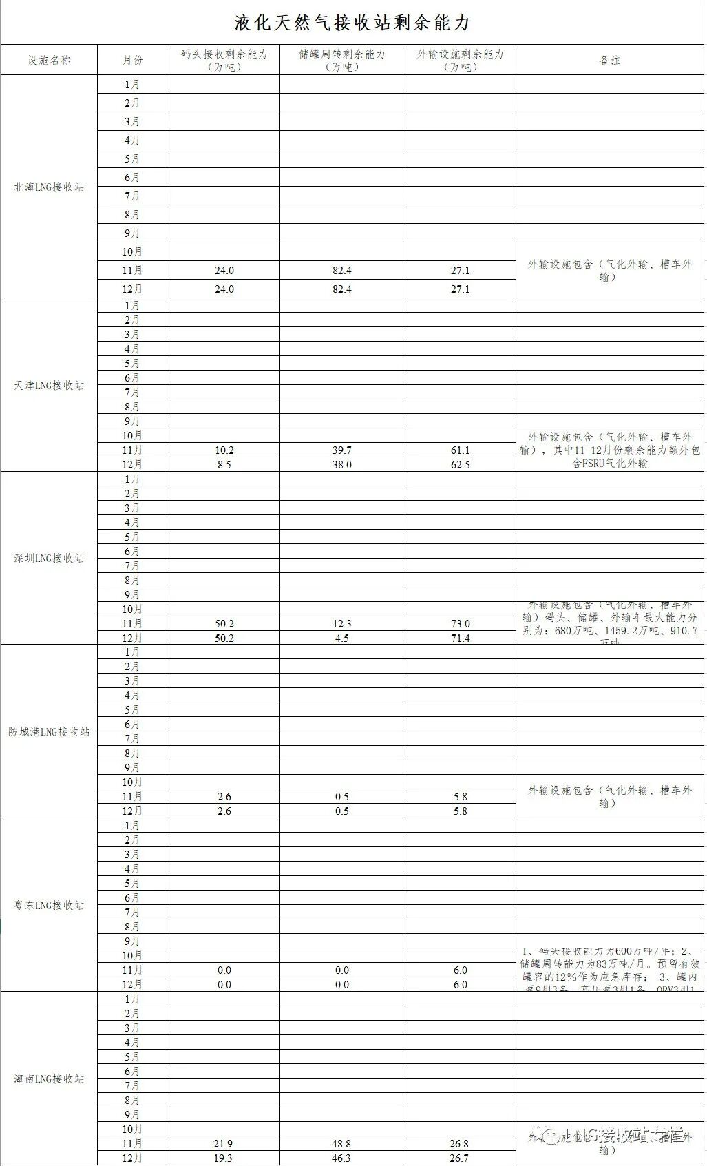 LNG接收站各月份剩余能力詳見LNG接收站剩余能力表。