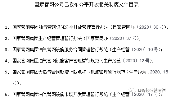 國(guó)家管網(wǎng)集團(tuán)已發(fā)布的相關(guān)制度文件主要包括《國(guó)家管網(wǎng)集團(tuán)油氣管網(wǎng)設(shè)施客戶管理暫行規(guī)范》《國(guó)家管網(wǎng)集團(tuán)油氣管網(wǎng)設(shè)施市場(chǎng)開發(fā)管理暫行規(guī)范》《國(guó)家管網(wǎng)集團(tuán)油氣管網(wǎng)設(shè)施公平開放管理暫行辦法》《國(guó)家管網(wǎng)集團(tuán)生產(chǎn)經(jīng)營(yíng)管理暫行辦法》等,詳見制度文件目錄。